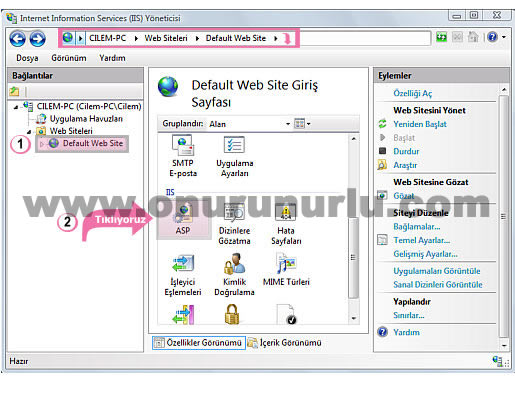 Burada karşımıza Internet Information Services (IIS) Yöneticisi ekranı çıkacak. Öncelikle Web Siteleri klasörü altındaki 1 sayısı ile gösterdiğimiz Default Web Site simgesine tıklıyoruz. Daha sonra ise ekranda görülen ASP simgesine tıklayarak açıyoruz.