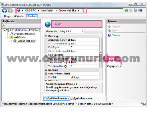 Orta konumdaki ASP bölümündeki seçeneklerden Üst Yolları Etkinleştir yazan seçeneğinin yanındaki False değerini True olarak değiştiriyoruz.