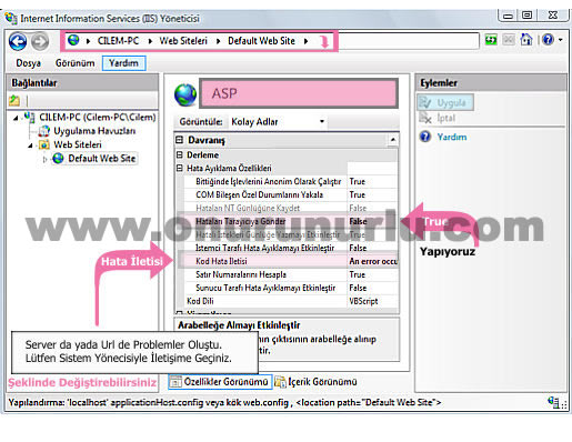 Hata Ayıklama Özellikleri bölümüne geliyoruz. Burada Hataları Tarayıcıya Gönder seçeneğinin yanındaki False değerini True olarak değiştiriyoruz. Böylelikle hataları tarayıcıdan izleme olanağımız olmuş oluyor. Daha sonrada Kod Hata İletisi seçeneğine dilerseniz Serverda ya da Urlde Problemler Oluştu. Lütfen Sistem Yöneticisiyle İletişime Geçiniz. şeklinde bir hata iletisi yazabilirsiniz. İşlemlerimizin aktif olabilmesi için sağ üst tarafta bulunan Eylemler başlığı altındaki Uygula butonuna basıp ayarlarımızı kaydediyoruz.