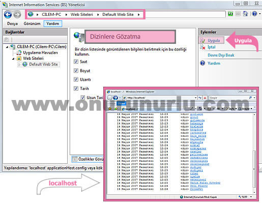 Localhost’ta dosyalarımızı görüntüleyebilmek için Dizinlere Gözatma seçeneğine tıklıyoruz açılan sayfada (Saat, Boyut gibi) kutucukların hepsini işaretliyoruz ve Uygula butonuna tıklıyoruz ( bu işlem web yayını yapacaksanız önerilmez ).
