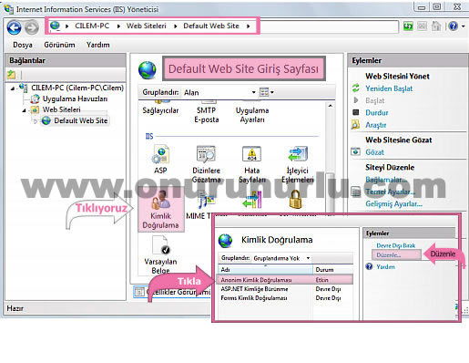 Kimlik Doğrulama simgesine tıkladıktan sonra karşımıza Anonim Kimlik Doğrulaması şeklinde bir seçenek çıkacak. Bu seçeneğin üzerine gelip sectikten sonra Eylemler başlığı altındaki Düzenle butonuna tıklıyoruz.