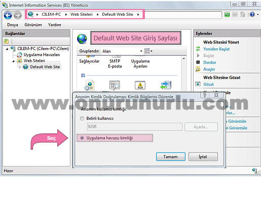 Düzenle butonuna tıkladığımızda IUSR şeklinde belirli bir kullanıcı seçilmiş olarak çıkar. Biz Uygulama havuzu kimliği seçeneğini işaretleyip Tamam butonuna tıklıyoruz ve uygulamalardan çıkıyoruz.