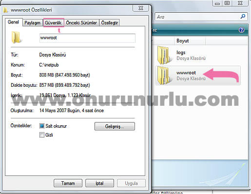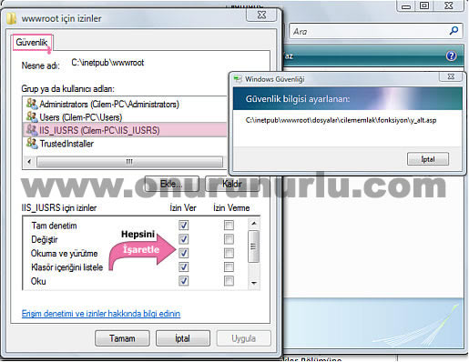 Yukarıdaki Güvenlik yazan bölüme giriyoruz. Güvenlik bölümünde IIS_IUSRS(BilgisayarınızınAdıIIS_IUSRS) şeklinde bir seçenek mevcut bu seçeneği seçip alttaki izin listesindeki tüm kutucukları işaretliyoruz ve Tamam butonuna tıklıyoruz. Aşağıdaki resimde göründüğü gibi Güvenlik Bilgisi Ayarlanan şeklinde bir güncelleme kutusu çıkıyor.