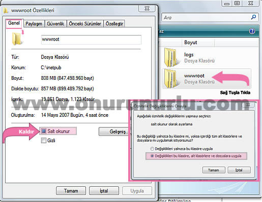 Karşımıza Öznitelik Değişikliklerini Onayla kutusu çıkıyor. Burada Değişiklikleri bu klasöre, alt Klasörler ve dosyalara uygula seçeneğini işaretleyip Tamam butonuna tıklıyoruz. Aynı şekilde db klasörümüzede son işlemleri yapıyoruz. Şimdi web sayfalarımızı sorunsuz olarak izleyip yayınlayabiliriz...