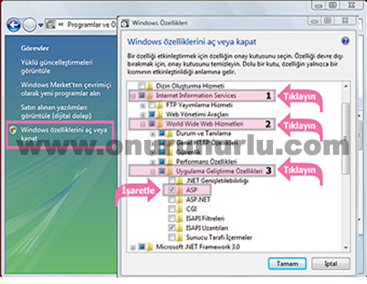 Bilgisayarınızda ASP dosyaları çalıştırmak için IIS yi kurmanız gerekmektedir. IIS işletim sistemleriyle birlikte gekir fakat kurulu olarak gelmez. Kurmak için aşağıdaki işlemleri sırasıyla yapınız. (Aşağıdaki İşlemler Windows 7 içindir. )