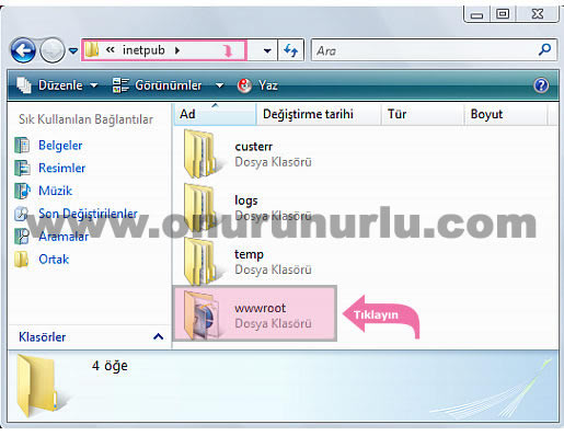 Bilgisayarımdan C sürücüsüne tıklıyoruz. Daha sonrada inetpub klasörüne tıklıyoruz. wwwroot klasörüne sağ tuşla tıklıyoruz ve Özellikler bölümüne tıklıyoruz.